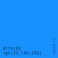 Цвет #1791FD в цветовой модели RGB обозначается тремя октетами (23, 145, 253) в десятичном формате и #1791FD в шестнадцатиричном (hex) формате, которые являются интенсивностью красного 23 (hex 17), интенсивность зелёного 145 (hex 91) и интенсивность синего 253 (hex FD).