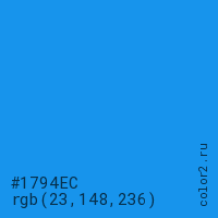 Цвет #1794EC в цветовой модели RGB обозначается тремя октетами (23, 148, 236) в десятичном формате и #1794EC в шестнадцатиричном (hex) формате, которые являются интенсивностью красного 23 (hex 17), интенсивность зелёного 148 (hex 94) и интенсивность синего 236 (hex EC).