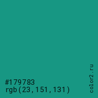 Цвет #179783 в цветовой модели RGB обозначается тремя октетами (23, 151, 131) в десятичном формате и #179783 в шестнадцатиричном (hex) формате, которые являются интенсивностью красного 23 (hex 17), интенсивность зелёного 151 (hex 97) и интенсивность синего 131 (hex 83).