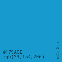 Цвет #179ACE в цветовой модели RGB обозначается тремя октетами (23, 154, 206) в десятичном формате и #179ACE в шестнадцатиричном (hex) формате, которые являются интенсивностью красного 23 (hex 17), интенсивность зелёного 154 (hex 9A) и интенсивность синего 206 (hex CE).