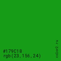 Цвет #179C18 в цветовой модели RGB обозначается тремя октетами (23, 156, 24) в десятичном формате и #179C18 в шестнадцатиричном (hex) формате, которые являются интенсивностью красного 23 (hex 17), интенсивность зелёного 156 (hex 9C) и интенсивность синего 24 (hex 18).