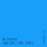 Цвет #179FFA в цветовой модели RGB обозначается тремя октетами (23, 159, 250) в десятичном формате и #179FFA в шестнадцатиричном (hex) формате, которые являются интенсивностью красного 23 (hex 17), интенсивность зелёного 159 (hex 9F) и интенсивность синего 250 (hex FA).
