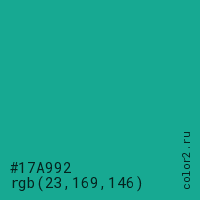Цвет #17A992 в цветовой модели RGB обозначается тремя октетами (23, 169, 146) в десятичном формате и #17A992 в шестнадцатиричном (hex) формате, которые являются интенсивностью красного 23 (hex 17), интенсивность зелёного 169 (hex A9) и интенсивность синего 146 (hex 92).