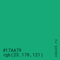Цвет #17AA79 в цветовой модели RGB обозначается тремя октетами (23, 170, 121) в десятичном формате и #17AA79 в шестнадцатиричном (hex) формате, которые являются интенсивностью красного 23 (hex 17), интенсивность зелёного 170 (hex AA) и интенсивность синего 121 (hex 79).