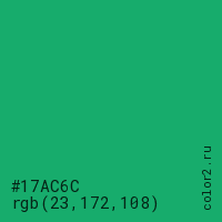 Цвет #17AC6C в цветовой модели RGB обозначается тремя октетами (23, 172, 108) в десятичном формате и #17AC6C в шестнадцатиричном (hex) формате, которые являются интенсивностью красного 23 (hex 17), интенсивность зелёного 172 (hex AC) и интенсивность синего 108 (hex 6C).
