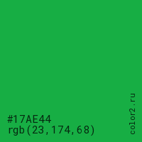 Цвет #17AE44 в цветовой модели RGB обозначается тремя октетами (23, 174, 68) в десятичном формате и #17AE44 в шестнадцатиричном (hex) формате, которые являются интенсивностью красного 23 (hex 17), интенсивность зелёного 174 (hex AE) и интенсивность синего 68 (hex 44).