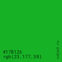 Цвет #17B126 в цветовой модели RGB обозначается тремя октетами (23, 177, 38) в десятичном формате и #17B126 в шестнадцатиричном (hex) формате, которые являются интенсивностью красного 23 (hex 17), интенсивность зелёного 177 (hex B1) и интенсивность синего 38 (hex 26).