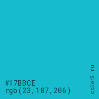 Цвет #17BBCE в цветовой модели RGB обозначается тремя октетами (23, 187, 206) в десятичном формате и #17BBCE в шестнадцатиричном (hex) формате, которые являются интенсивностью красного 23 (hex 17), интенсивность зелёного 187 (hex BB) и интенсивность синего 206 (hex CE).