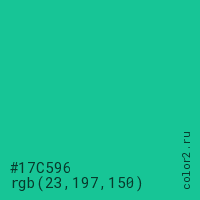Цвет #17C596 в цветовой модели RGB обозначается тремя октетами (23, 197, 150) в десятичном формате и #17C596 в шестнадцатиричном (hex) формате, которые являются интенсивностью красного 23 (hex 17), интенсивность зелёного 197 (hex C5) и интенсивность синего 150 (hex 96).