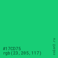 Цвет #17CD75 в цветовой модели RGB обозначается тремя октетами (23, 205, 117) в десятичном формате и #17CD75 в шестнадцатиричном (hex) формате, которые являются интенсивностью красного 23 (hex 17), интенсивность зелёного 205 (hex CD) и интенсивность синего 117 (hex 75).
