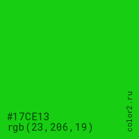 Цвет #17CE13 в цветовой модели RGB обозначается тремя октетами (23, 206, 19) в десятичном формате и #17CE13 в шестнадцатиричном (hex) формате, которые являются интенсивностью красного 23 (hex 17), интенсивность зелёного 206 (hex CE) и интенсивность синего 19 (hex 13).