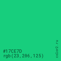 Цвет #17CE7D в цветовой модели RGB обозначается тремя октетами (23, 206, 125) в десятичном формате и #17CE7D в шестнадцатиричном (hex) формате, которые являются интенсивностью красного 23 (hex 17), интенсивность зелёного 206 (hex CE) и интенсивность синего 125 (hex 7D).