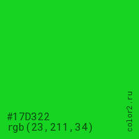 Цвет #17D322 в цветовой модели RGB обозначается тремя октетами (23, 211, 34) в десятичном формате и #17D322 в шестнадцатиричном (hex) формате, которые являются интенсивностью красного 23 (hex 17), интенсивность зелёного 211 (hex D3) и интенсивность синего 34 (hex 22).