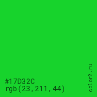 Цвет #17D32C в цветовой модели RGB обозначается тремя октетами (23, 211, 44) в десятичном формате и #17D32C в шестнадцатиричном (hex) формате, которые являются интенсивностью красного 23 (hex 17), интенсивность зелёного 211 (hex D3) и интенсивность синего 44 (hex 2C).