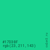 Цвет #17D38F в цветовой модели RGB обозначается тремя октетами (23, 211, 143) в десятичном формате и #17D38F в шестнадцатиричном (hex) формате, которые являются интенсивностью красного 23 (hex 17), интенсивность зелёного 211 (hex D3) и интенсивность синего 143 (hex 8F).