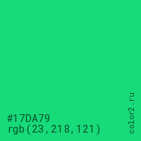 Цвет #17DA79 в цветовой модели RGB обозначается тремя октетами (23, 218, 121) в десятичном формате и #17DA79 в шестнадцатиричном (hex) формате, которые являются интенсивностью красного 23 (hex 17), интенсивность зелёного 218 (hex DA) и интенсивность синего 121 (hex 79).