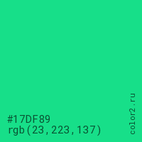 Цвет #17DF89 в цветовой модели RGB обозначается тремя октетами (23, 223, 137) в десятичном формате и #17DF89 в шестнадцатиричном (hex) формате, которые являются интенсивностью красного 23 (hex 17), интенсивность зелёного 223 (hex DF) и интенсивность синего 137 (hex 89).