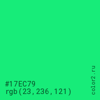 Цвет #17EC79 в цветовой модели RGB обозначается тремя октетами (23, 236, 121) в десятичном формате и #17EC79 в шестнадцатиричном (hex) формате, которые являются интенсивностью красного 23 (hex 17), интенсивность зелёного 236 (hex EC) и интенсивность синего 121 (hex 79).