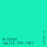 Цвет #17EFBA в цветовой модели RGB обозначается тремя октетами (23, 239, 186) в десятичном формате и #17EFBA в шестнадцатиричном (hex) формате, которые являются интенсивностью красного 23 (hex 17), интенсивность зелёного 239 (hex EF) и интенсивность синего 186 (hex BA).