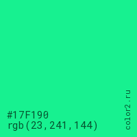 Цвет #17F190 в цветовой модели RGB обозначается тремя октетами (23, 241, 144) в десятичном формате и #17F190 в шестнадцатиричном (hex) формате, которые являются интенсивностью красного 23 (hex 17), интенсивность зелёного 241 (hex F1) и интенсивность синего 144 (hex 90).