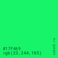 Цвет #17F469 в цветовой модели RGB обозначается тремя октетами (23, 244, 105) в десятичном формате и #17F469 в шестнадцатиричном (hex) формате, которые являются интенсивностью красного 23 (hex 17), интенсивность зелёного 244 (hex F4) и интенсивность синего 105 (hex 69).