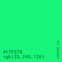 Цвет #17F578 в цветовой модели RGB обозначается тремя октетами (23, 245, 120) в десятичном формате и #17F578 в шестнадцатиричном (hex) формате, которые являются интенсивностью красного 23 (hex 17), интенсивность зелёного 245 (hex F5) и интенсивность синего 120 (hex 78).