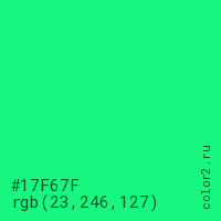 Цвет #17F67F в цветовой модели RGB обозначается тремя октетами (23, 246, 127) в десятичном формате и #17F67F в шестнадцатиричном (hex) формате, которые являются интенсивностью красного 23 (hex 17), интенсивность зелёного 246 (hex F6) и интенсивность синего 127 (hex 7F).