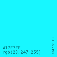 Цвет #17F7FF в цветовой модели RGB обозначается тремя октетами (23, 247, 255) в десятичном формате и #17F7FF в шестнадцатиричном (hex) формате, которые являются интенсивностью красного 23 (hex 17), интенсивность зелёного 247 (hex F7) и интенсивность синего 255 (hex FF).