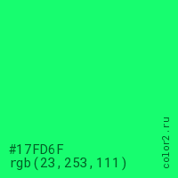 Цвет #17FD6F в цветовой модели RGB обозначается тремя октетами (23, 253, 111) в десятичном формате и #17FD6F в шестнадцатиричном (hex) формате, которые являются интенсивностью красного 23 (hex 17), интенсивность зелёного 253 (hex FD) и интенсивность синего 111 (hex 6F).