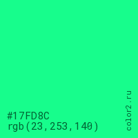 Цвет #17FD8C в цветовой модели RGB обозначается тремя октетами (23, 253, 140) в десятичном формате и #17FD8C в шестнадцатиричном (hex) формате, которые являются интенсивностью красного 23 (hex 17), интенсивность зелёного 253 (hex FD) и интенсивность синего 140 (hex 8C).