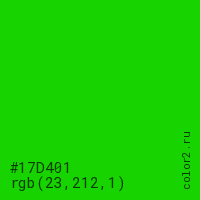 Цвет #17D401 в цветовой модели RGB обозначается тремя октетами (23, 212, 1) в десятичном формате и #17D401 в шестнадцатиричном (hex) формате, которые являются интенсивностью красного 23 (hex 17), интенсивность зелёного 212 (hex D4) и интенсивность синего 1 (hex 01).