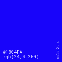 Цвет #1804FA в цветовой модели RGB обозначается тремя октетами (24, 4, 250) в десятичном формате и #1804FA в шестнадцатиричном (hex) формате, которые являются интенсивностью красного 24 (hex 18), интенсивность зелёного 4 (hex 04) и интенсивность синего 250 (hex FA).