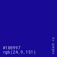 Цвет #180997 в цветовой модели RGB обозначается тремя октетами (24, 9, 151) в десятичном формате и #180997 в шестнадцатиричном (hex) формате, которые являются интенсивностью красного 24 (hex 18), интенсивность зелёного 9 (hex 09) и интенсивность синего 151 (hex 97).
