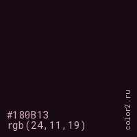 Цвет #180B13 в цветовой модели RGB обозначается тремя октетами (24, 11, 19) в десятичном формате и #180B13 в шестнадцатиричном (hex) формате, которые являются интенсивностью красного 24 (hex 18), интенсивность зелёного 11 (hex 0B) и интенсивность синего 19 (hex 13).