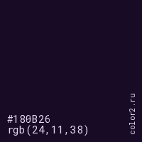 Цвет #180B26 в цветовой модели RGB обозначается тремя октетами (24, 11, 38) в десятичном формате и #180B26 в шестнадцатиричном (hex) формате, которые являются интенсивностью красного 24 (hex 18), интенсивность зелёного 11 (hex 0B) и интенсивность синего 38 (hex 26).
