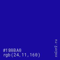 Цвет #180BA0 в цветовой модели RGB обозначается тремя октетами (24, 11, 160) в десятичном формате и #180BA0 в шестнадцатиричном (hex) формате, которые являются интенсивностью красного 24 (hex 18), интенсивность зелёного 11 (hex 0B) и интенсивность синего 160 (hex A0).