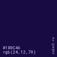 Цвет #180C46 в цветовой модели RGB обозначается тремя октетами (24, 12, 70) в десятичном формате и #180C46 в шестнадцатиричном (hex) формате, которые являются интенсивностью красного 24 (hex 18), интенсивность зелёного 12 (hex 0C) и интенсивность синего 70 (hex 46).