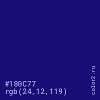 Цвет #180C77 в цветовой модели RGB обозначается тремя октетами (24, 12, 119) в десятичном формате и #180C77 в шестнадцатиричном (hex) формате, которые являются интенсивностью красного 24 (hex 18), интенсивность зелёного 12 (hex 0C) и интенсивность синего 119 (hex 77).