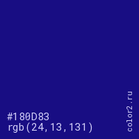 Цвет #180D83 в цветовой модели RGB обозначается тремя октетами (24, 13, 131) в десятичном формате и #180D83 в шестнадцатиричном (hex) формате, которые являются интенсивностью красного 24 (hex 18), интенсивность зелёного 13 (hex 0D) и интенсивность синего 131 (hex 83).