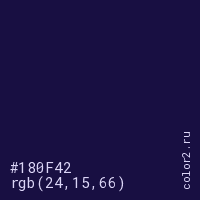 Цвет #180F42 в цветовой модели RGB обозначается тремя октетами (24, 15, 66) в десятичном формате и #180F42 в шестнадцатиричном (hex) формате, которые являются интенсивностью красного 24 (hex 18), интенсивность зелёного 15 (hex 0F) и интенсивность синего 66 (hex 42).