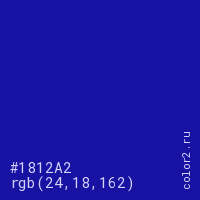 Цвет #1812A2 в цветовой модели RGB обозначается тремя октетами (24, 18, 162) в десятичном формате и #1812A2 в шестнадцатиричном (hex) формате, которые являются интенсивностью красного 24 (hex 18), интенсивность зелёного 18 (hex 12) и интенсивность синего 162 (hex A2).