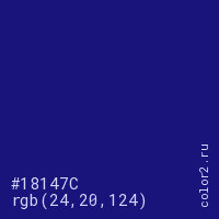 Цвет #18147C в цветовой модели RGB обозначается тремя октетами (24, 20, 124) в десятичном формате и #18147C в шестнадцатиричном (hex) формате, которые являются интенсивностью красного 24 (hex 18), интенсивность зелёного 20 (hex 14) и интенсивность синего 124 (hex 7C).