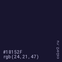 Цвет #18152F в цветовой модели RGB обозначается тремя октетами (24, 21, 47) в десятичном формате и #18152F в шестнадцатиричном (hex) формате, которые являются интенсивностью красного 24 (hex 18), интенсивность зелёного 21 (hex 15) и интенсивность синего 47 (hex 2F).