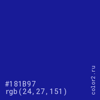 Цвет #181B97 в цветовой модели RGB обозначается тремя октетами (24, 27, 151) в десятичном формате и #181B97 в шестнадцатиричном (hex) формате, которые являются интенсивностью красного 24 (hex 18), интенсивность зелёного 27 (hex 1B) и интенсивность синего 151 (hex 97).