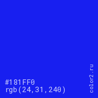 Цвет #181FF0 в цветовой модели RGB обозначается тремя октетами (24, 31, 240) в десятичном формате и #181FF0 в шестнадцатиричном (hex) формате, которые являются интенсивностью красного 24 (hex 18), интенсивность зелёного 31 (hex 1F) и интенсивность синего 240 (hex F0).
