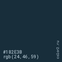 Цвет #182E3B в цветовой модели RGB обозначается тремя октетами (24, 46, 59) в десятичном формате и #182E3B в шестнадцатиричном (hex) формате, которые являются интенсивностью красного 24 (hex 18), интенсивность зелёного 46 (hex 2E) и интенсивность синего 59 (hex 3B).