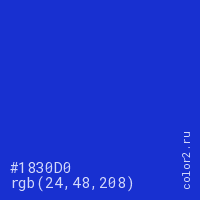 Цвет #1830D0 в цветовой модели RGB обозначается тремя октетами (24, 48, 208) в десятичном формате и #1830D0 в шестнадцатиричном (hex) формате, которые являются интенсивностью красного 24 (hex 18), интенсивность зелёного 48 (hex 30) и интенсивность синего 208 (hex D0).
