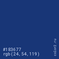 Цвет #183677 в цветовой модели RGB обозначается тремя октетами (24, 54, 119) в десятичном формате и #183677 в шестнадцатиричном (hex) формате, которые являются интенсивностью красного 24 (hex 18), интенсивность зелёного 54 (hex 36) и интенсивность синего 119 (hex 77).