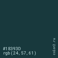 Цвет #18393D в цветовой модели RGB обозначается тремя октетами (24, 57, 61) в десятичном формате и #18393D в шестнадцатиричном (hex) формате, которые являются интенсивностью красного 24 (hex 18), интенсивность зелёного 57 (hex 39) и интенсивность синего 61 (hex 3D).
