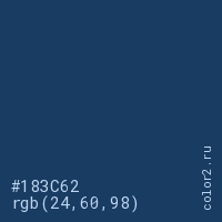 Цвет #183C62 в цветовой модели RGB обозначается тремя октетами (24, 60, 98) в десятичном формате и #183C62 в шестнадцатиричном (hex) формате, которые являются интенсивностью красного 24 (hex 18), интенсивность зелёного 60 (hex 3C) и интенсивность синего 98 (hex 62).